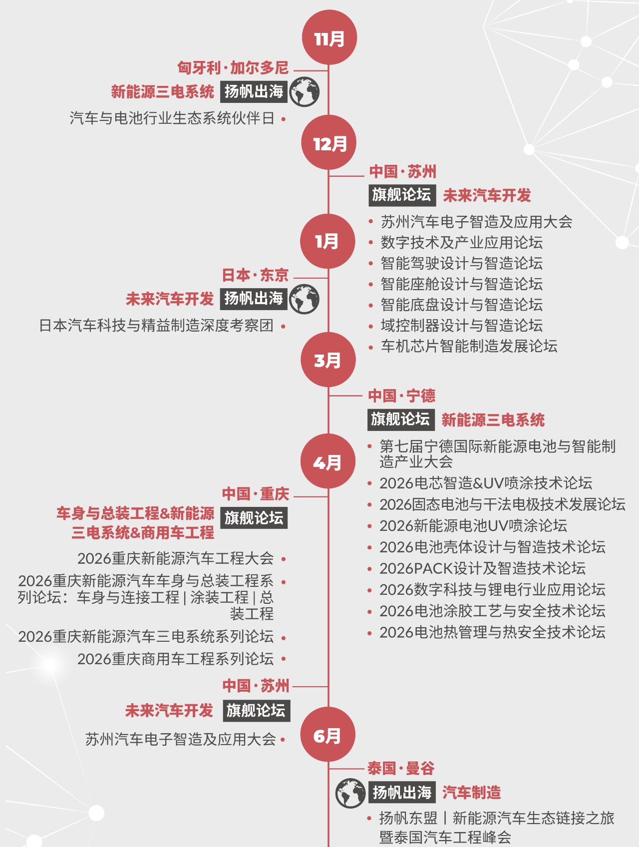 2026年,我們將推出多種活動形式,覆蓋旗艦論壇、閉門峰會、主題系列會議、Workshop科技工坊、Techshow高新科技發(fā)布、圓桌對話、科技導覽、揚帆出海、先鋒獎項、走進智造、商務(wù)酒會等全維度活動,為您呈現(xiàn)一場多元化的創(chuàng)新生態(tài)體驗。從聚焦沖焊涂總工藝的新能源工程大會、探索前瞻開發(fā)與測試技術(shù)的專業(yè)論壇,到深度研討前沿科技的TechShow & Workshop;從沉浸式國內(nèi)外智造產(chǎn)線工廠考察,到促進深度鏈接的圓桌會議、交流晚宴與精準配對,通過旗艦峰會、主題會議、Workshop科技工坊、出海及商務(wù)考察等全維度活動打造集技術(shù)洞察、知識共享與商業(yè)合作為一體的高端平臺。